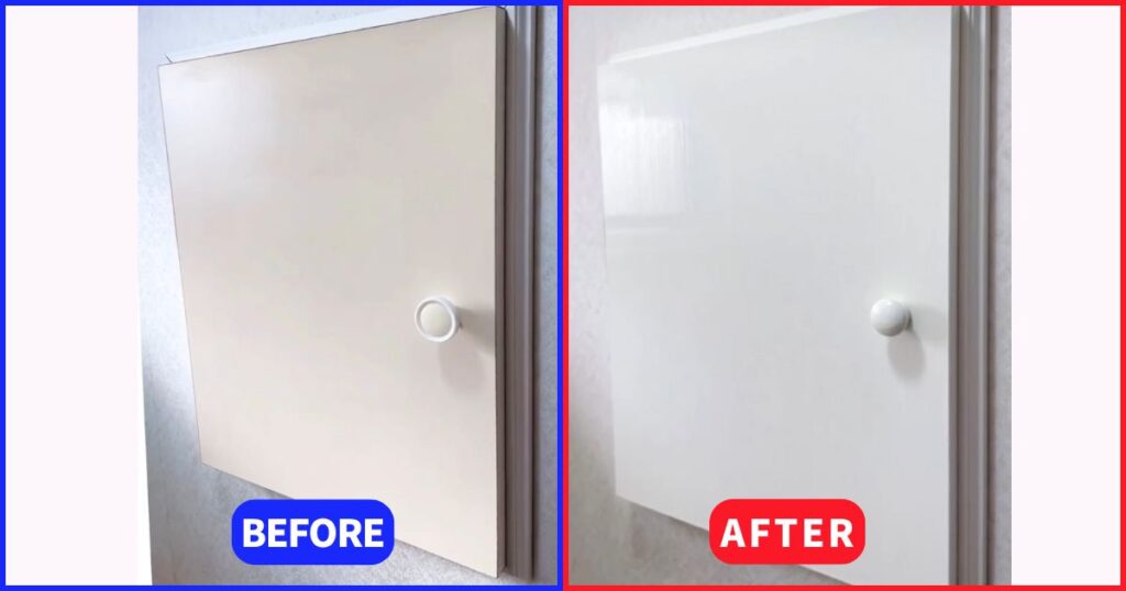 収納扉: 25年の間に少しずつ黄ばみ、トイレ全体を古臭いイメージにさせていました。お気に入りのペンキでピュアホワイトに塗り替えたことで、トイレがグッと明るくなりました。