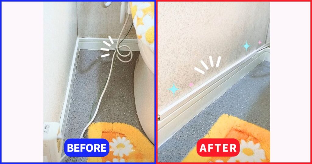 以前は、狭いトイレの奥でブラブラする配線が邪魔で、掃除の手が全く届きませんでした。そのせいで、奥の壁や巾木(はばき)はホコリが溜まり、カビだらけに……。
