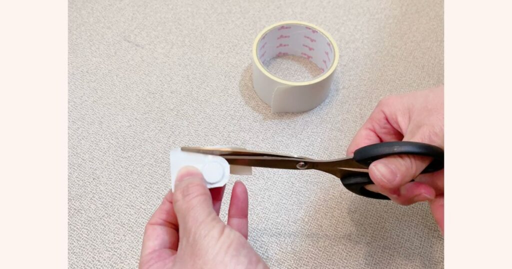 丸い超強力マグネットを布テープで上下から挟むように覆い、周りをカットします。これでサビ防止と再利用が可能になります。