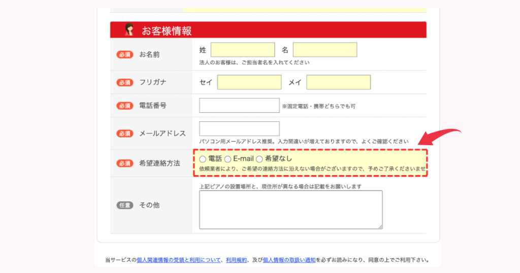 ※実際の入力画面(公式サイトより引用)。「希望連絡方法」が選べるので安心です。
